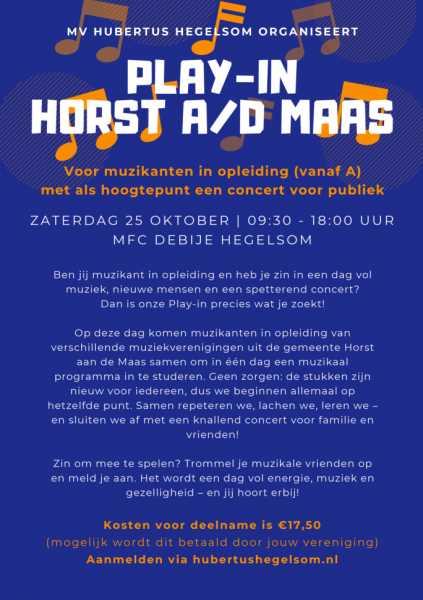 Dé Play-in voor jonge muzikanten uit Horst aan de Maas. Onder begeleiding van professionele repetitoren worden toffe muziekstukken ingestudeerd, die aan het einde van de dag worden uitgevoerd tijdens een slotconcert, vrij toegankelijk voor alle geïnteresseerden!